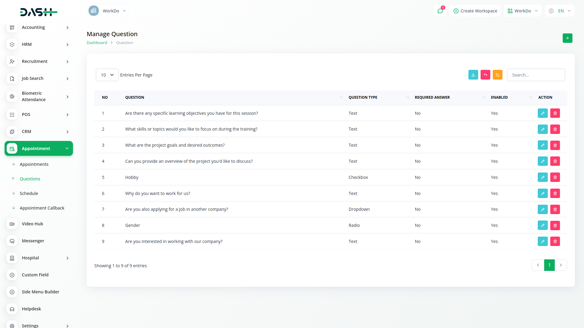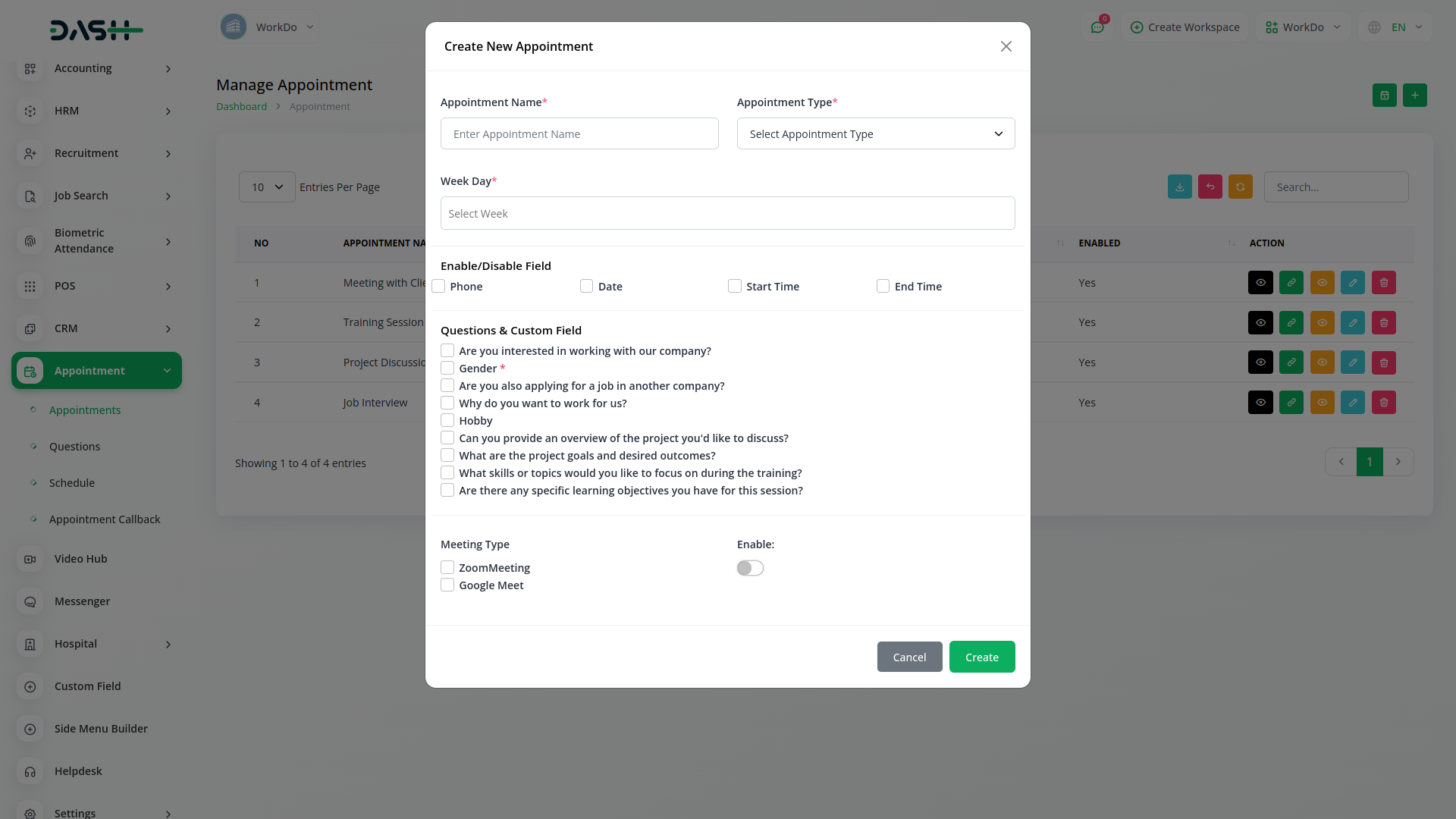 You just need to select a field and the appropriate type from the list. There are four field types available: Text, Radio, Dropdown and Checkbox You will be able to show the question without any extra effort. And you can decide whether to make that question mandatory or not. And you can also decide whether you want to keep that question in the appointment section or not.