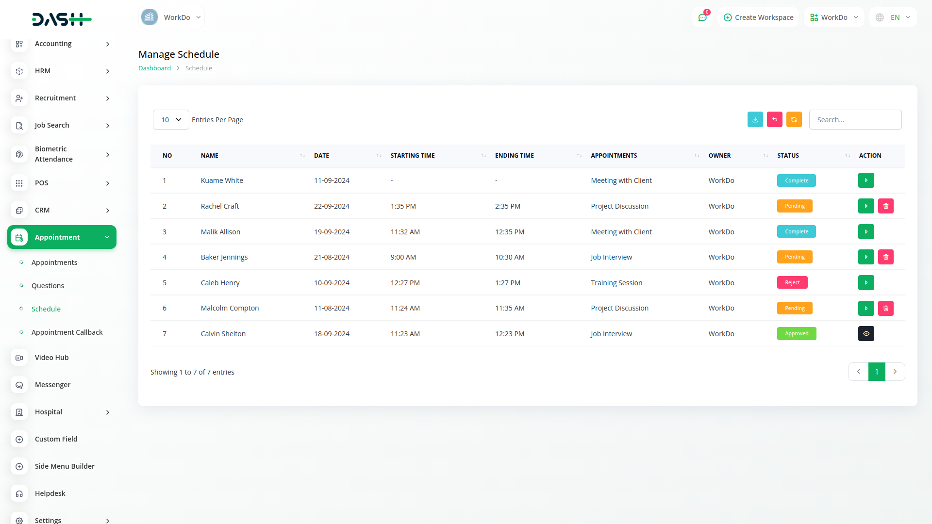 In the appointment section, you can create an appointment. It has a calendar button that displays all appointments and changes color according to the appointment status. It has a copy link button, in which any user can fill out the appointment form.
