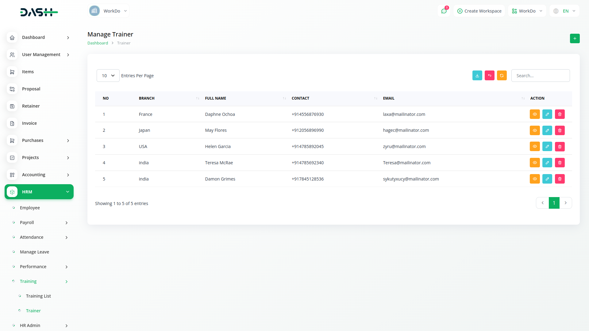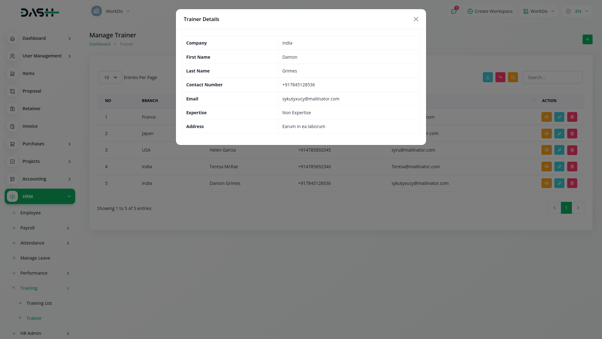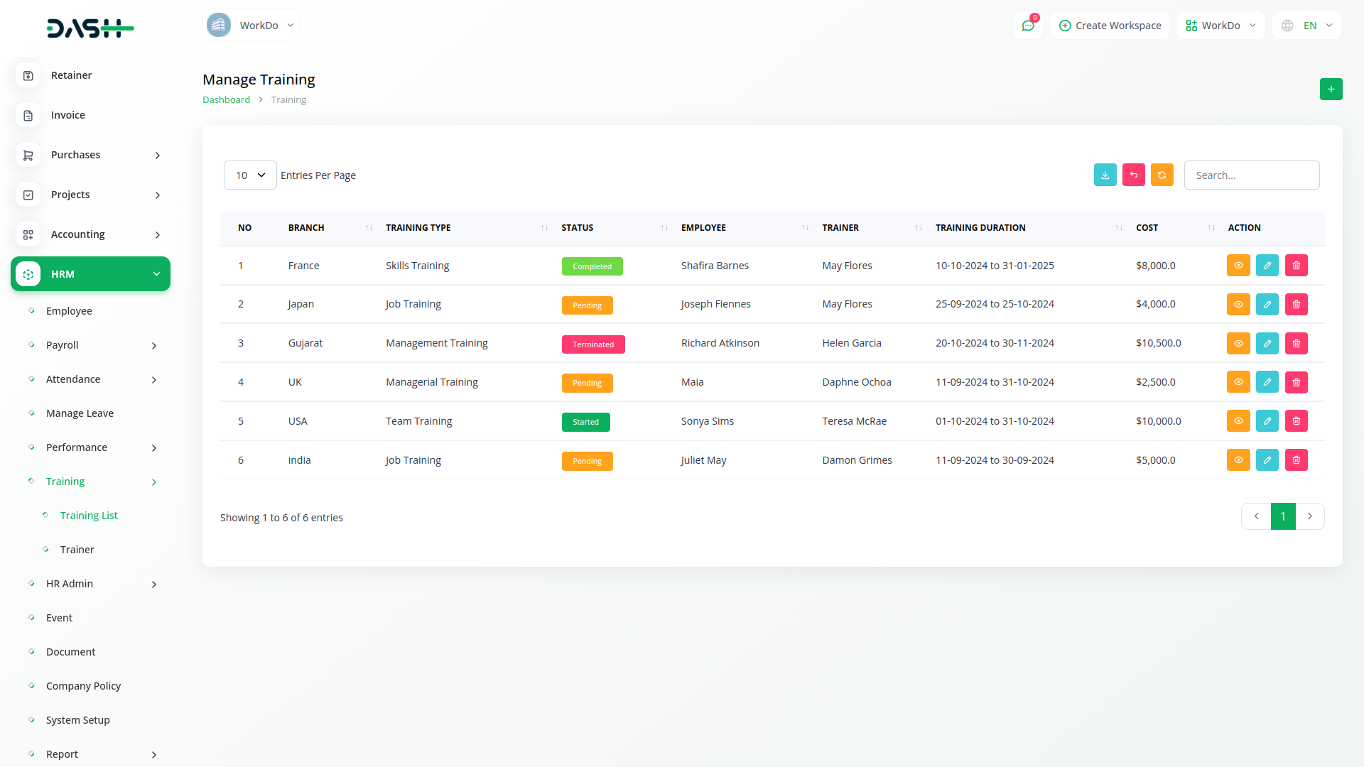 Employee training is quintessential in modern organizations. You can keep a tab on training activities by assigning a cost, duration, training, and training mode for each employee. Keep the list of your trainers handy through the easy listing.